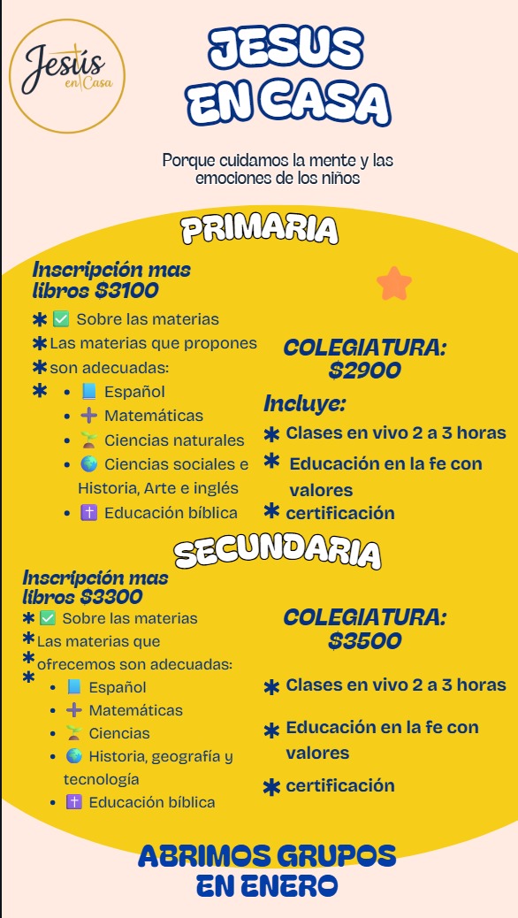 Queridos padres de familia, En Jesús en Casa Homeschool, nos enorgullecemos de ofrecer una educación en línea de calidad, centrada en los valores y con materiales semanales y certificación incluidos. Nuestro objetivo es brindar una experiencia de aprendizaje enriquecedora para sus hijos, al mismo tiempo que les enseñamos valores importantes que les servirán en su vida diaria.